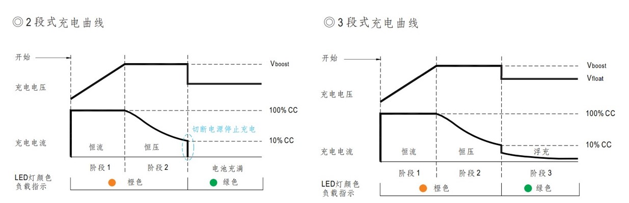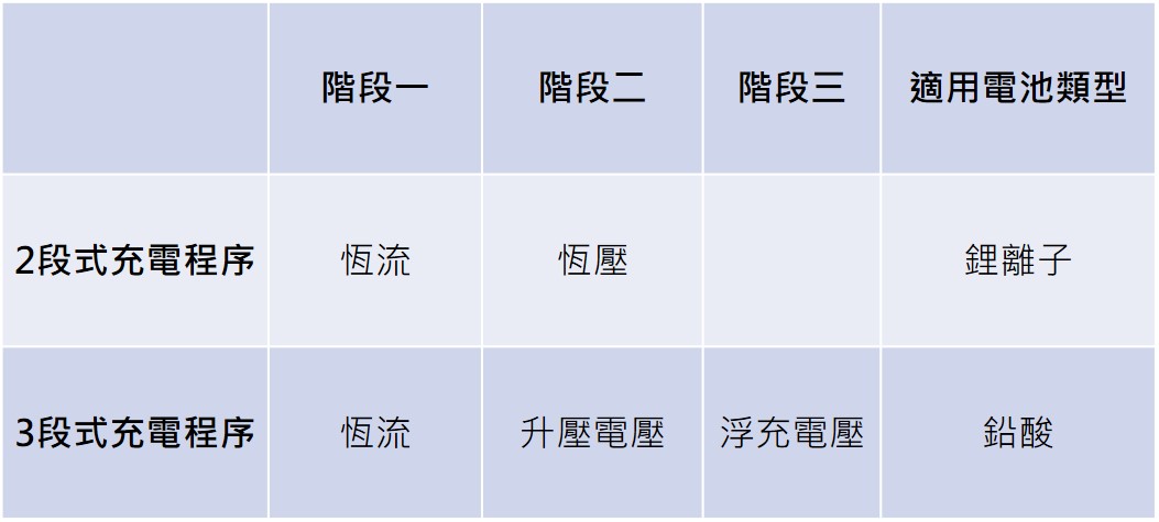 充電是在受控電壓范圍內(nèi),從充電器對電池提供受控電流的過程。根據(jù)電池模塊的配置,充電電流和電壓會有不同。此外,根據(jù)化學(xué)電氣特性,充電設(shè)定可以是 2 段式或 3段式 。 2 段式充電從恒流充電階段開始,接者是恒壓階段。 3 段式充電是在恒壓階段再額外提供一段浮充充電電壓,使鉛酸類型的電池充電電量更加完全。常用的充電程序如下表所示。